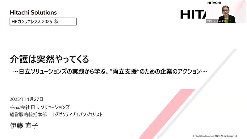 介護はある日突然始まります。社員の約4人に1人が近い将来に介護を担う可能性があるという社内調査結果をもとに、企業が制度整備だけでなく、社員の声を拾い、風土を醸成することで「仕事と介護の両立」を支える実践的なアクションを紹介します。制度の活用促進、管理職の巻き込み、社内コミュニティの形成など、日立ソリューションズの取り組みを通じて、企業が今できることを考えます。